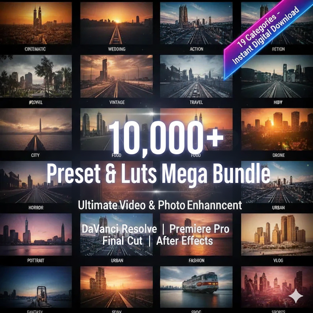 This massive bundle includes over 10.000+ professional LUTs organized into 19 unique categories, giving you every tone and cinematic look you’ll ever need. Whether you’re editing films, travel vlogs, weddings, commercials, or YouTube videos — these LUTs instantly transform your footage with just one click.